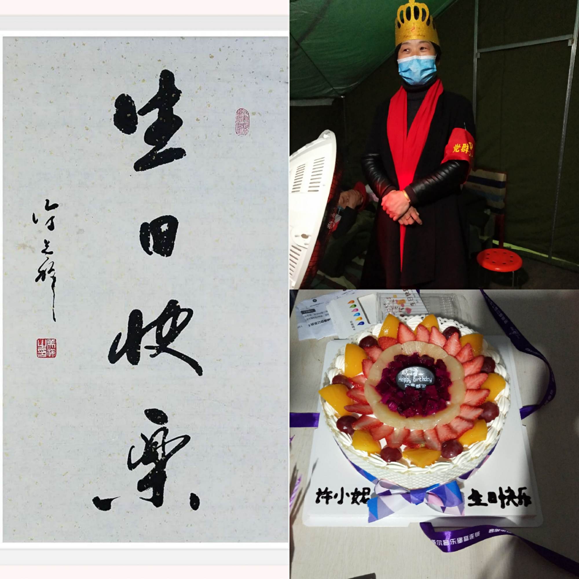 2020年农历正月26日,忙碌了一天的她接到孩子们的电话,说晚上让她回家一趟请她吃蛋糕,这时她才想起今天是她的生日,她说现在正是防控最吃劲的时候,大家都在值守她不能离开,于是就让家里人把蛋糕送到卡点的帐篷里,和值班的同志一起分享了她的生日蛋糕,度过了一个非常有意义的48周岁生日。