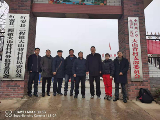 (宫教授一行六人与大背山村领导合影,从左至右朱江,陈德军,姜建鴻,村委工作人员,杨书记,宫哲兵,祝平燕,余长庭)