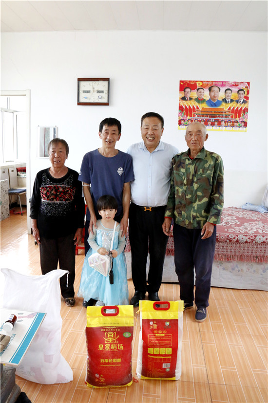 孙佑刚、王京伟、单玉志等爱心人士在捐赠物资前合影留念 在宏盘中心校的安排下,北京的爱心人士孙佑刚、王京伟、单玉志等一行首先走进该校四年级学生吴颖家里进行慰问。吴颖从小和奶奶、爸爸生活在一起,奶奶常年有病,但是她没有被生活所压倒,而是奋发斗志,立志用学习来改变自己的命运。随后,爱心人士有走访了其它贫困家庭及低保户家庭。