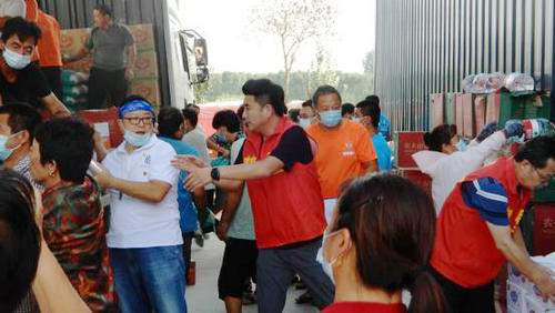 多家公益捐赠物资单位与志愿者在装车现场合影留念