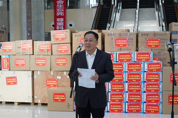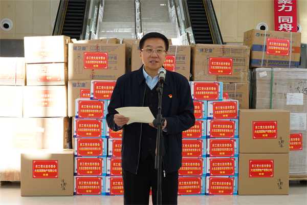 田晓峰主委代表农工党大连市委会在捐赠仪式上讲话,他说:“守望相助,同心抗疫,在我市疫情防控工作取得阶段性成果,即将全面恢复正常社会秩序的关键时刻,农工党大连市委会联手大连迈得信科技发展有限公司,大连淇霖物产有限公司,向大连医科大学捐赠防疫物资,表达我们携手共克时艰的一份心情,助推我市防疫工作取得最后胜利。