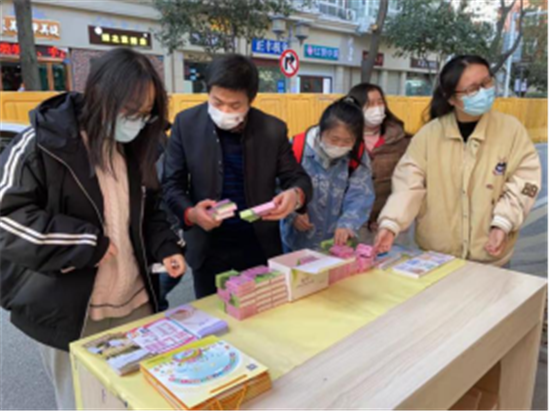 工作人员向大学生发放药具用品及宣传册