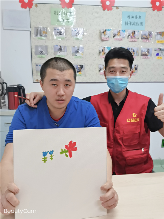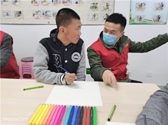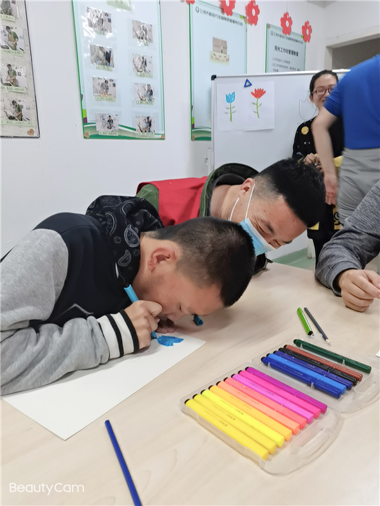 志愿者和孩子们一起拿起彩笔,体验色彩与那份童心童画。在志愿者们一对一的耐心引导下,“孩子们”都画出了自己心里的两朵花。
