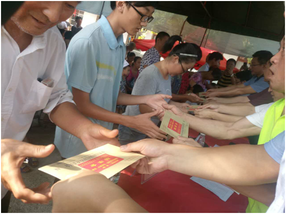 志愿人员清理书包上的姓名 龙根绿金秋助学一一走进黄沙街新天村!!!为50名贫困学生捐赠现金、麦点银果、中国好人徐宙雄等共捐助爱心物资共计7万元,感谢岳阳县纪委党委、苇业公司、麦点公益大力支持!
