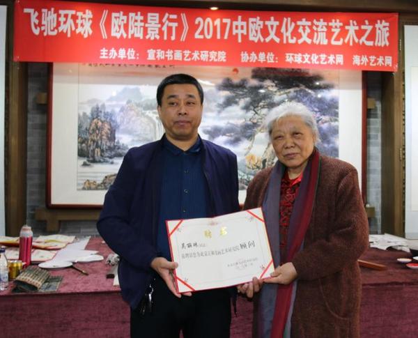 宣和艺术院执行院长单玉志向吴丽珠老师颁发北京宣和艺术院顾问聘书及《欧陆景行》中欧艺术之旅参团特聘顾问聘书