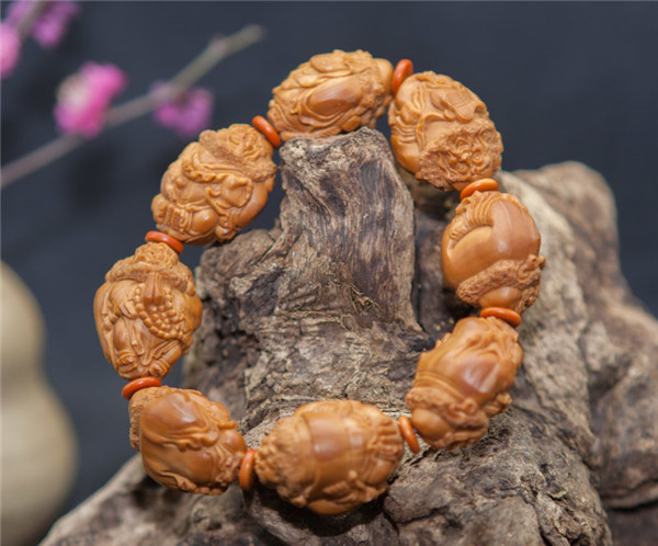 如今,他以雕弥勒为乐,他笑着说:“又可爱又喜气,雕起来特别带劲。”当然,他也获得了不少奖,他的作品不仅人物逼真,呼之欲出,而且刀法娴熟,刻画精细,让人感到作者的匠心独运和精湛的技艺。勤奋的付出,必有收获,在2010年中国首届“苏艺杯”工艺美术展中其核雕作品《十八罗汉》在众多作品中脱颖而出获得金奖。在2012年北京举行的工艺品大赛中,核雕作品《八宝弥勒》获得最佳作品金奖。2014年《浮雕八仙》在中国北京文玩艺术品博览会,经组委会评审团评定为第三届琢艺杯雕刻大赛“银奖”作品。未来沈春华还想申请专利,真正地打出自己的品牌。