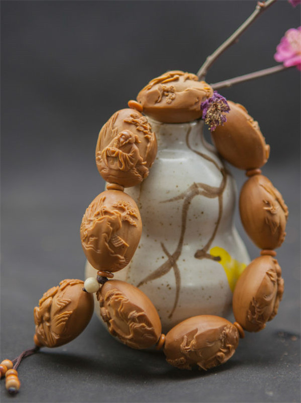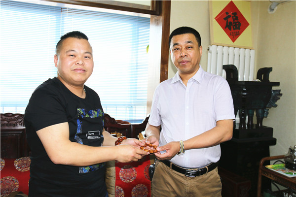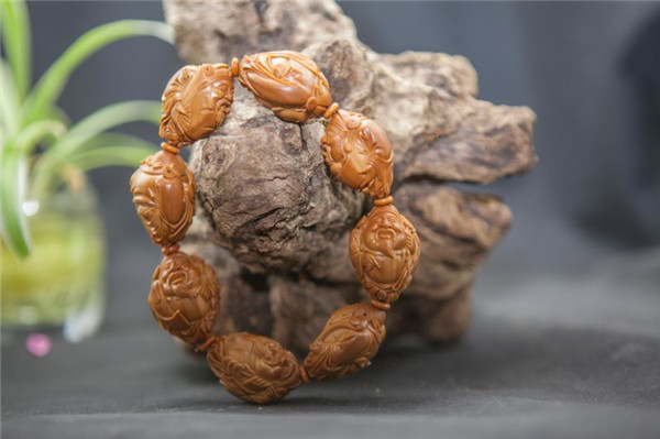 舟山核雕大师沈春华向单玉志院长赠送核雕手串