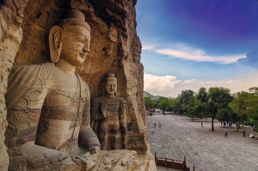 山西省大同市云冈石窟位于山西省大同市西郊武周山北崖,石窟依山开凿,东西绵延1000米,现存主要洞窟45个,大小窟龛252个,石雕造像51000余躯,是我国规模最大的古代石窟群之一。据文献记载,北魏和平年间(公元460年至465年)由一个著名的和尚昙曜主持,在京城(平城,今大同市)西郊武周塞,开凿石窟五所,现存云冈第16窟至20窟,就是当时开凿最早的所谓"昙曜五窟"。其他主要洞窟,也大多完成于北魏太和十八年(公元494年)孝文帝迁都洛阳之前。从石窟所保存的纪年铭刻和艺术风格上看,这处宏伟的艺术工程基本上都是北魏的遗物,距今已有1500多年的历史。