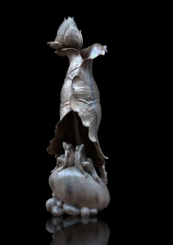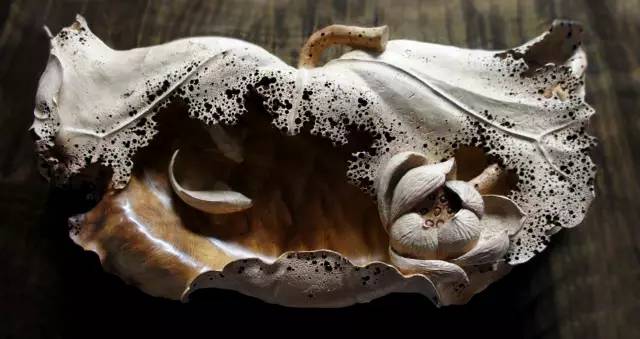 枯死的残荷上栖息着两只充满生机的青蛙,显得真实、自然而宁静。他的雕刀的青蛙,或匍匐在莲蓬边,或趴在藕节上,或蹦上竹节,活灵活现。李成军的木雕世界总是很细腻,他不断强调作品要有令人回味的节奏和韵律。就像那“枯荷木雕”,既显得质感轻薄,又粗犷凝重,让人浮想联翩。