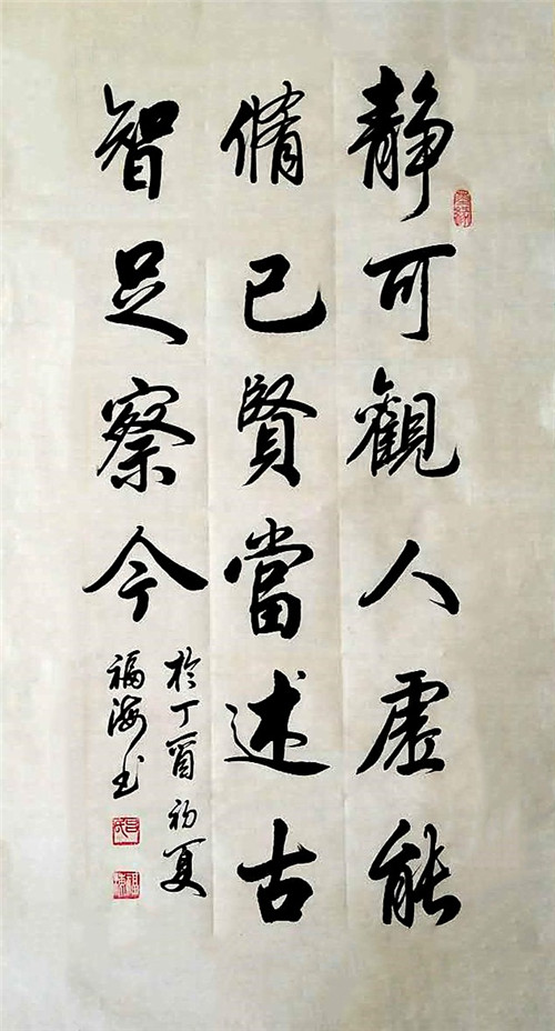 吕福海,男,1956年生于河北省青县马厂镇陈缺屯村,七六年入伍,七九年参加对越反击战的一位老兵,也是一位老党员,受过党的教育,所以一直在发挥自己的才艺。农闲时以书为乐,以德习书,弘扬中华文化,发挥书画的正能量。自幼酷爱书画,从小习临二王,赵孟頫,董其昌等古人书帖,不断练习毛体,作品屡次登书登报,2000年入青县文联书协会员;2005年参加沧州市国欣杯书画大赛中获优秀奖第一名;同年入沧州市书协会员。2014年参加北京军天书画院书画展获金奖;2015年参加中国梦想杯书画展获银奖;2015年入河北省毛体书画协会会员;2017年参加庐山杯书画展获金奖。书画联盟网、云慧轩艺术工作室合作书法老师。在当地及周边地区多次举办书画交流活动,由电视台跟踪报道,受到文化界的广泛好评和认可!