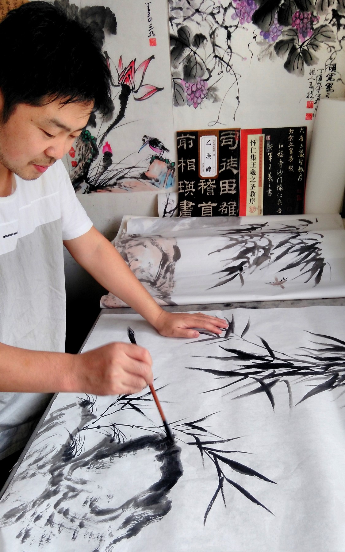 王松(号福报松 ),男,安徽肥东人, 自幼酷爱绘画,擅长中国画山水、竹、荷,兼及国画花鸟人物、油画和手工雕刻等方面的创作。先后从师和受教于著名画家孙原太教授(号北原山人)、书法名家王心瀚先生和著名画家张志远先生,深受中国著名画家罗序伦先生(号墨竹斋主)的影响。