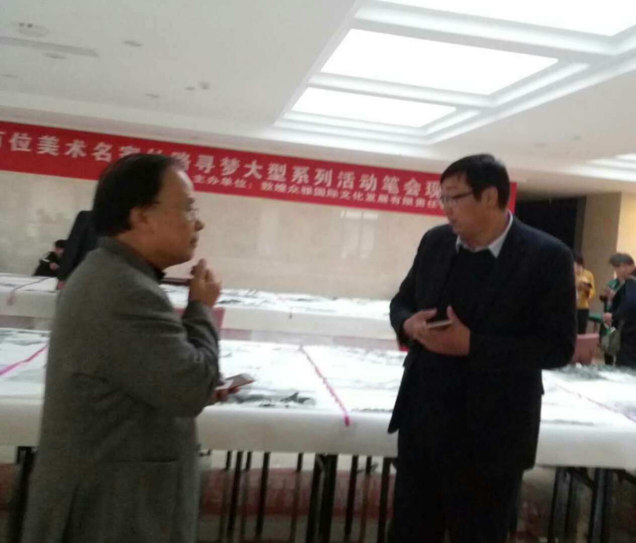 扈本询在《汇画经典 问道敦煌》首届百杰美术名杰絲路寻梦百人作品展笔会现场,与敦煌市委副书记、大景区管委会委主任 李春林交流把“百杰艺术家绘画长卷”纳入敦煌“文博会”的构思。