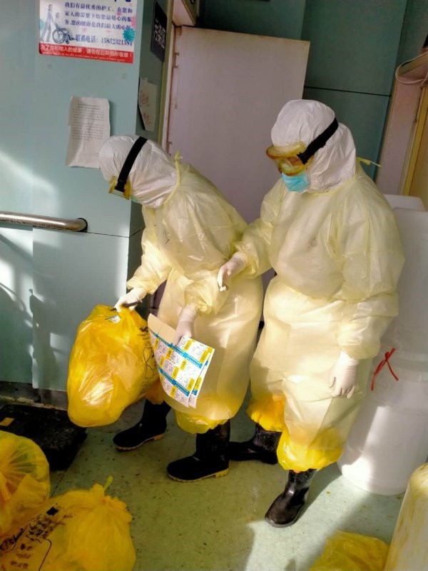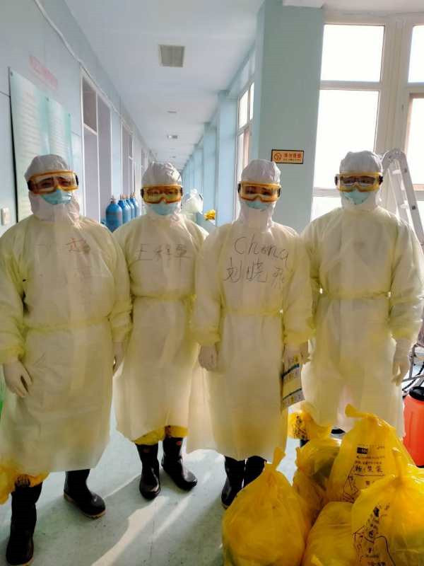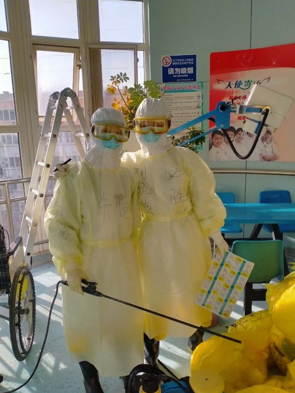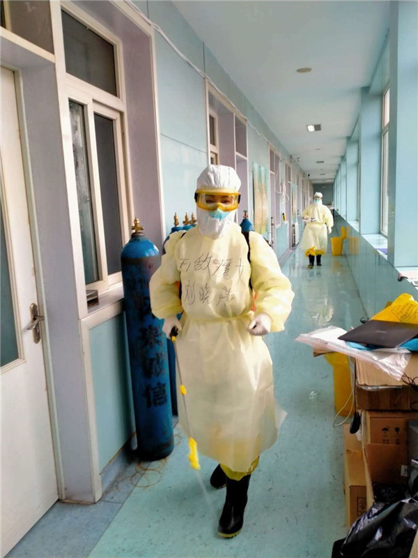 十五天工作之后,刘晓燕被调入了一线病区负责消毒杀菌工作一周,为了保证所有医务人员不被病毒感染,她一个瘦弱的年轻妈妈穿着厚重的防护服,背着二十斤重的消毒液每天要对几百米的楼道和数十间病房进行喷洒、擦拭,还要将所有垃圾运送到指定地点。