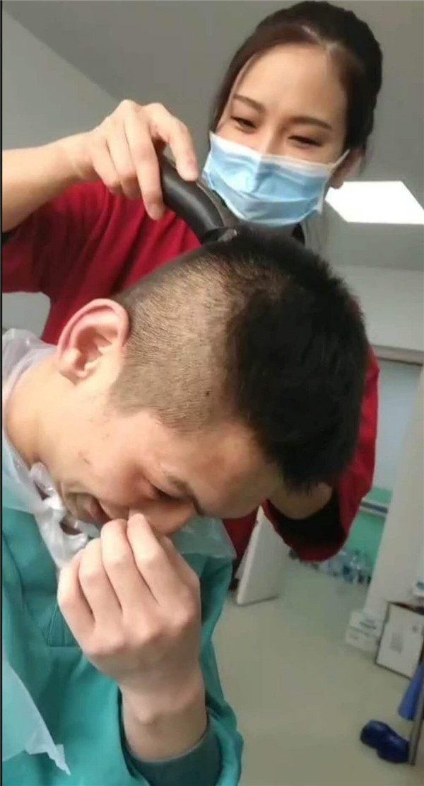 她在一线期间给同事理发