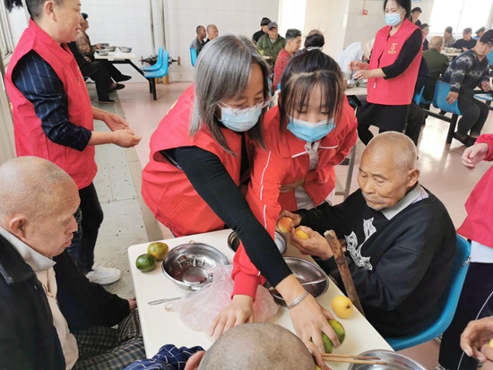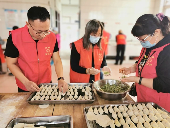 鲜红的马甲衬托着金秋飒爽和漂亮帅气,他们是丰润区昌盛大江户公益团队。昌盛大江户志愿者团队是唐山市丰润区自发的爱心组织,他们多年行进在爱心路上,为那些需要帮助的人提供无偿帮助。在姚亚馨精心组织下,不同单位不同地方却有着共同心愿的志愿者们和院里的工作人员一起择菜剁馅包饺子。有的志愿者在包完饺子、发完水果就匆匆的离开了。为什么呢?原来他们回家还得为父母,为孩子做饭呢。