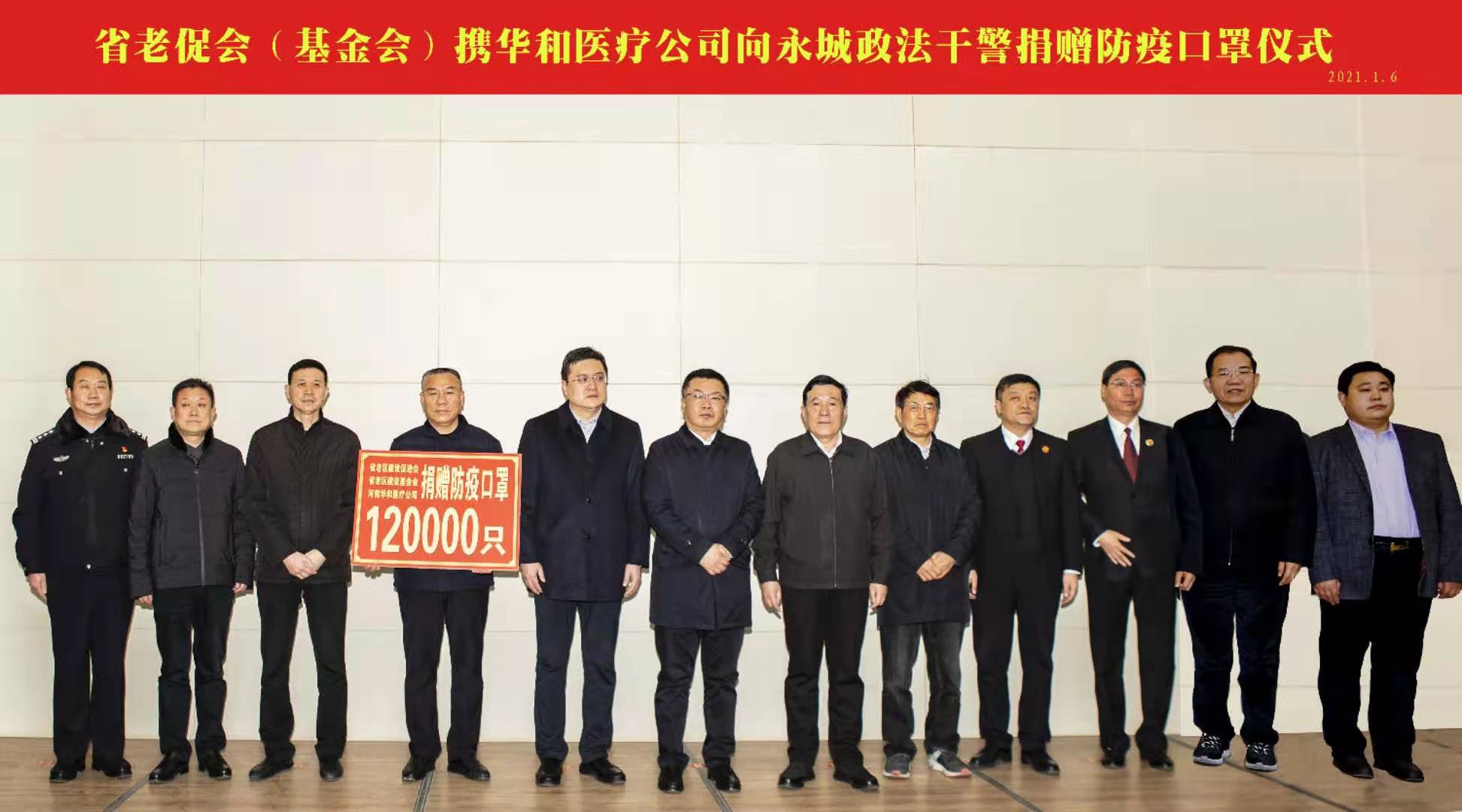 2021年1月6日上午,省老区建设促进会携河南华和医疗科技有限公司,向永城市政法干警捐赠口罩仪式在永 城市举行。省老区建设促进会副会长、省人大原副主任铁代生,省老促会常务副秘书长、省人大环资工委副主任 马恒心,省老促会常务理事、省老区建设基金会理事长、省扶贫办原主任张成智, 商丘市委常委、政法委书记牛亚东,商丘市老促会会长、商丘市政协原副主席刘德文,商丘市老促会副会长、商 丘日报社原总编辑李军祥,永城市长高大力、永城市副市长梁廷振、永城市办公室主任曲海波、商丘市老促会常务副秘书长田启营,永城市法院院长候文、永城市检察院党组书记检察长马南桦、永城市公安局长程峰、永城市政法委副书记王永建、商丘市老促会副秘书长邵诗话等出席捐赠仪式; 永城市委副书记、市长高大立,省老区建设促进会副会长、省人大原副主任铁代生分别致辞;永城市委常委、政 法委书记邵明杰代表政法部门和政法干警接受捐赠。河南华和医疗科技有限公司负责人潘铭代表爱心企业讲话。 据介绍,新冠疫情爆发后,面对突如其来的疫情,河南华和医疗科技有限公司积极响应党委政府关于做好疫 情防控工作的要求,号召动员公司员工,全力以赴参与到抗击新冠疫情的阻击战中。在抗击疫情最为严峻的时刻 ,该公司积极协助党委政府采购医疗物资,为一线公安干警、防疫人员捐赠口罩、防护服、为中小学校捐赠医疗 垃圾桶、防护服、 进口温枪等物资,为疫情防控贡献了一份力量。