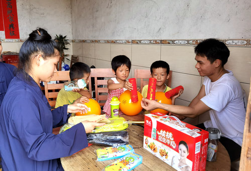 5月29日上午,白石山三清观、会仙岩、白沙罗丛岩道众,在麻垌镇、白沙镇等深入走访慰问留守幼儿家庭,为留守幼儿送去了书包、笔、作业本、牛奶、文具、糖果等慰问品,并详细了解留守儿童家庭的生活状况,勉励他们克服困难、共同努力,增强生活的信心。